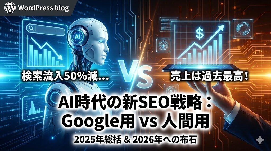 コラム 2025年12月31日 【2025年総括】検索アクセス50%減でも売上が伸びた理由。AI時代の「Google用」vs「ユーザー用」記事戦略 今回が2025年最後のコラムです。 今年はAIが完全に「日常」になった1年でしたね。「検索してもAIの概要ばかりで、サイトに人が来ない」……そんな悲鳴が多くの現... Read More