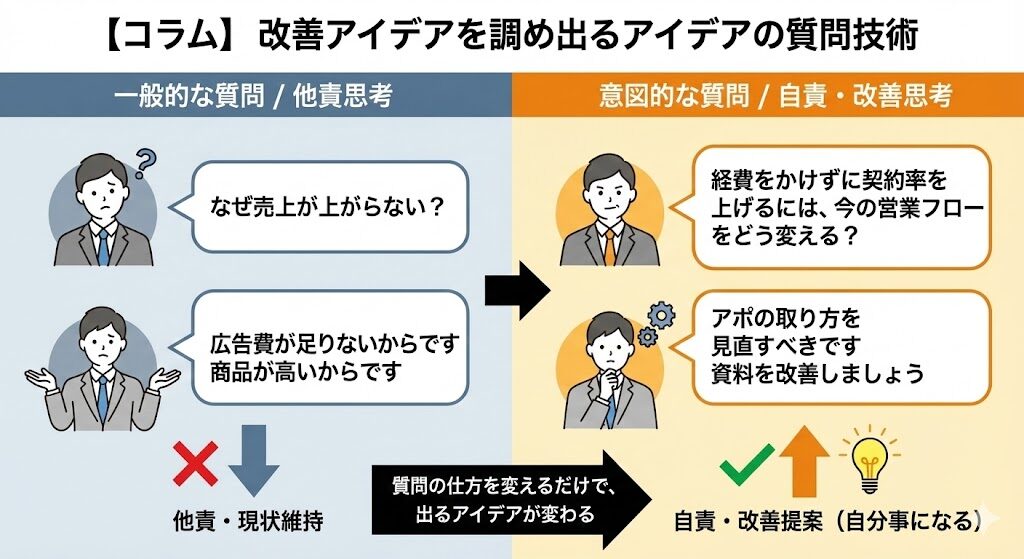 ⭕ 良い質問:「経費をかけずに売上を上げるには、今の契約率をどう改善すればいい?」 → 社員の答え:「営業フローを見直す必要がありますね…」